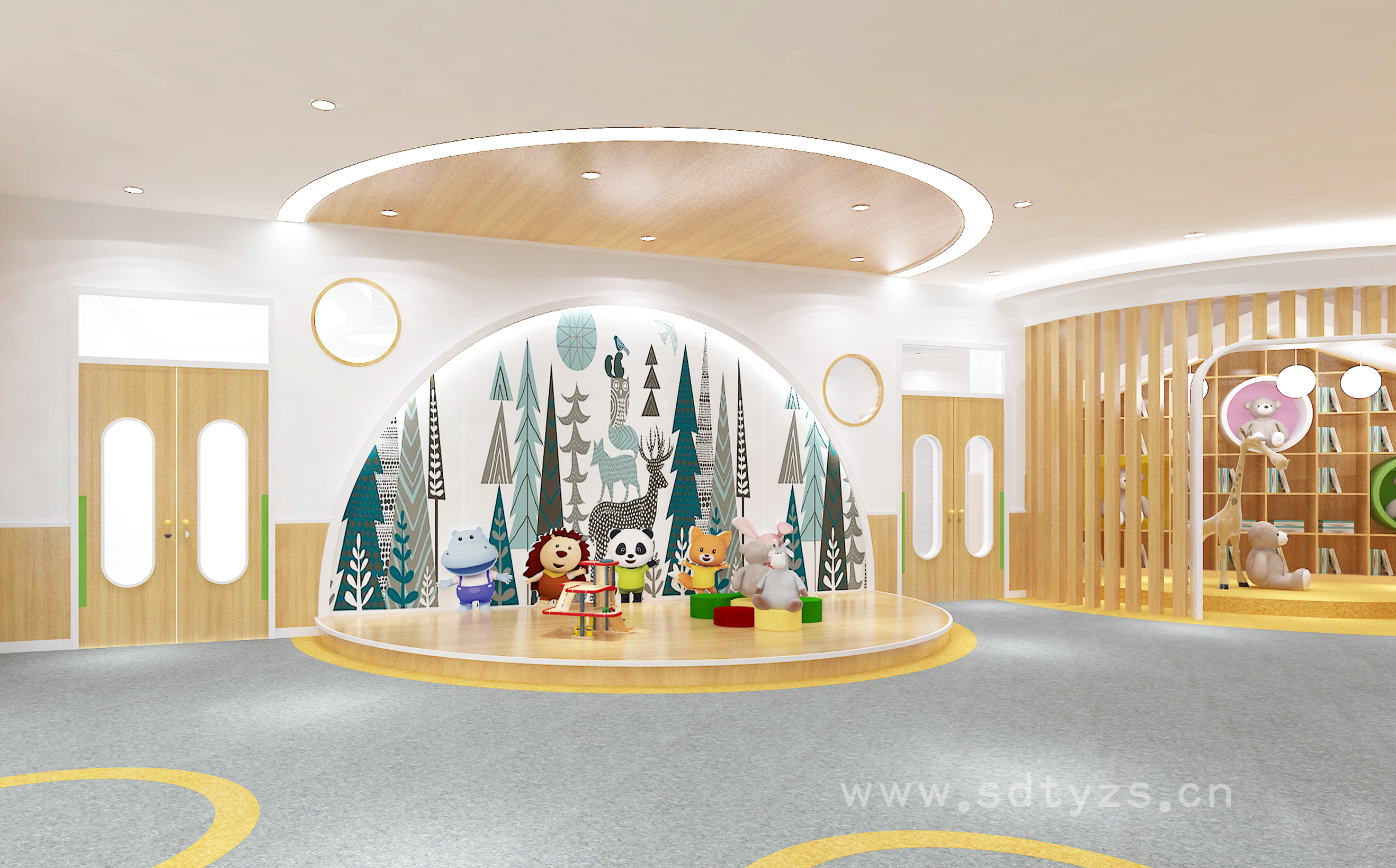 中性色在園所中的運用,首先帶給我們的是安全感,這種安全感一方面的環境的感受,讓人輕松、愜意。另一方面往往這樣的用色不會出現太大偏差,對于設計來說更為安全。其次,中性色還是一種很知性的顏色,在配色中起到很好的協調作用,來凸顯其他顏色,所以有時中性色和鮮艷色調的色彩搭配,可以讓人眼前一亮。