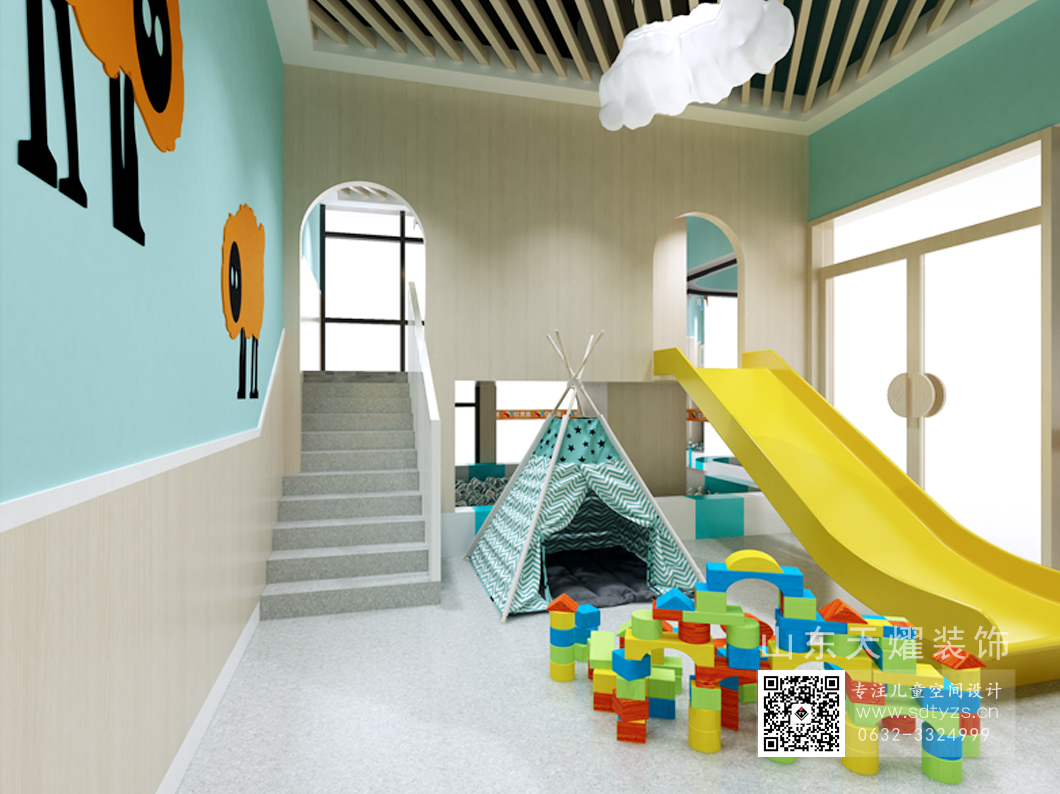 將淺松石色注入大面積的亮白色空間中,作為點綴,與黃水仙色玩具形成對比,十分醒目,可謂吸睛十足。并且設計師還搭配優雅舒適的淺松石色帳篷,更是將空間營造的愈加自然舒適,簡潔卡通的墻面裝飾與燈具烘托出摩登的時尚感。