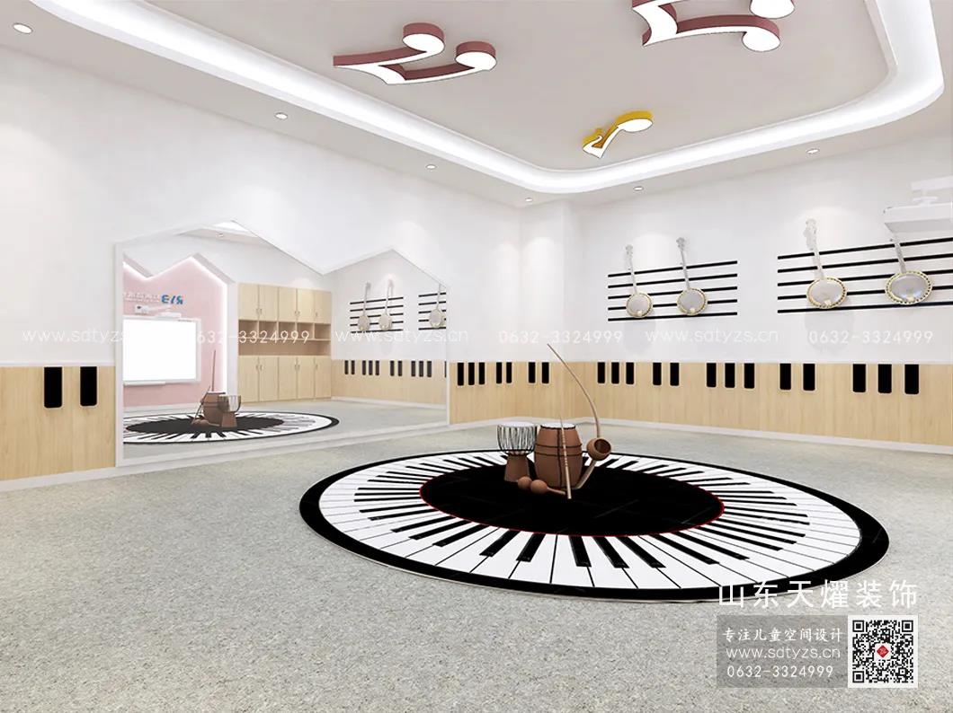 頂面跳動的音符燈和墻面的鋼琴按鍵都是在強調空間屬性,木色和地面的灰色都起到了中和作用,讓整個空間柔和,但又能凸顯色彩。