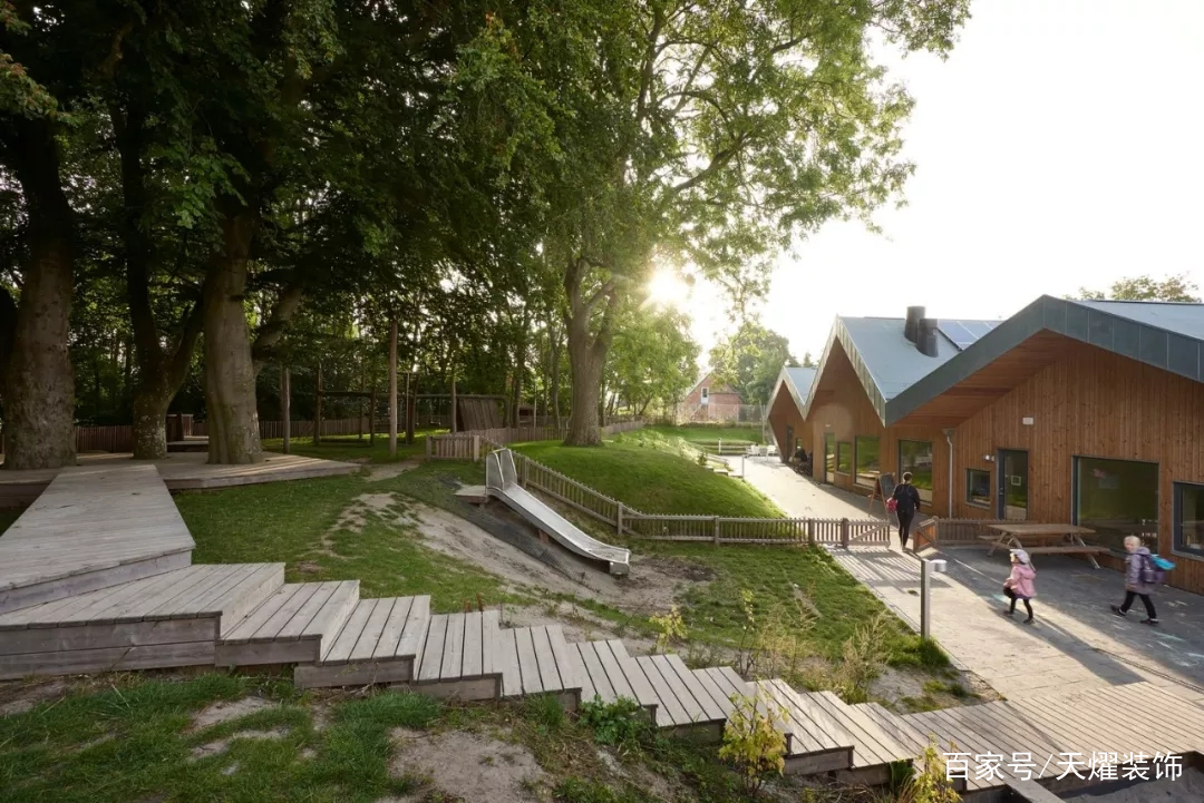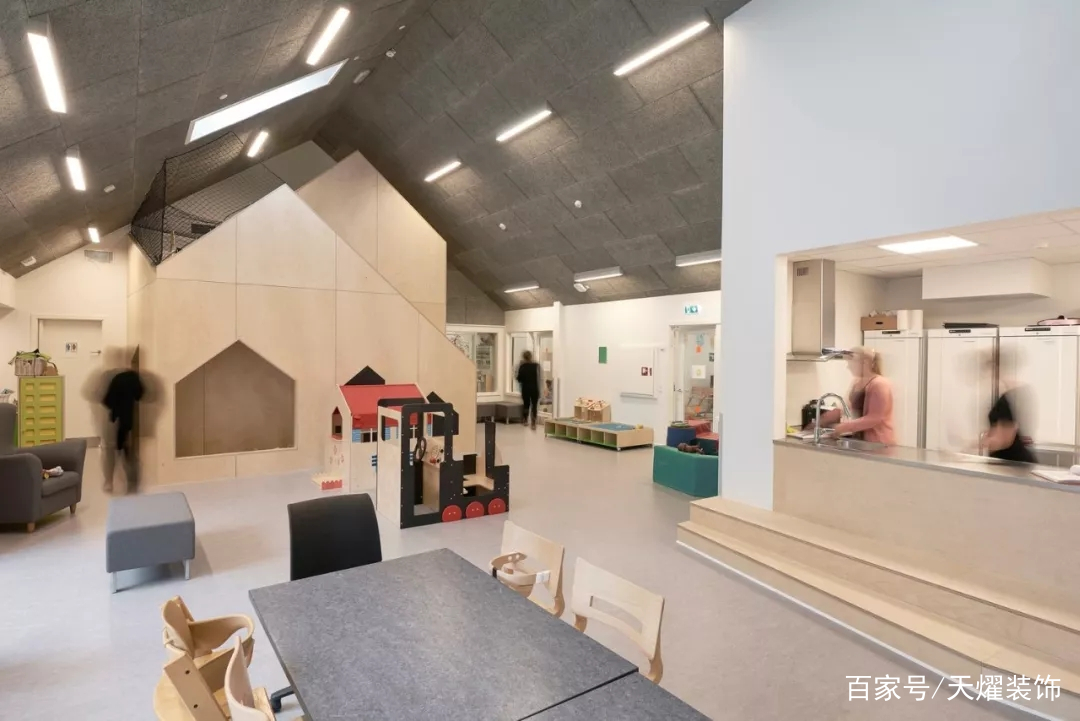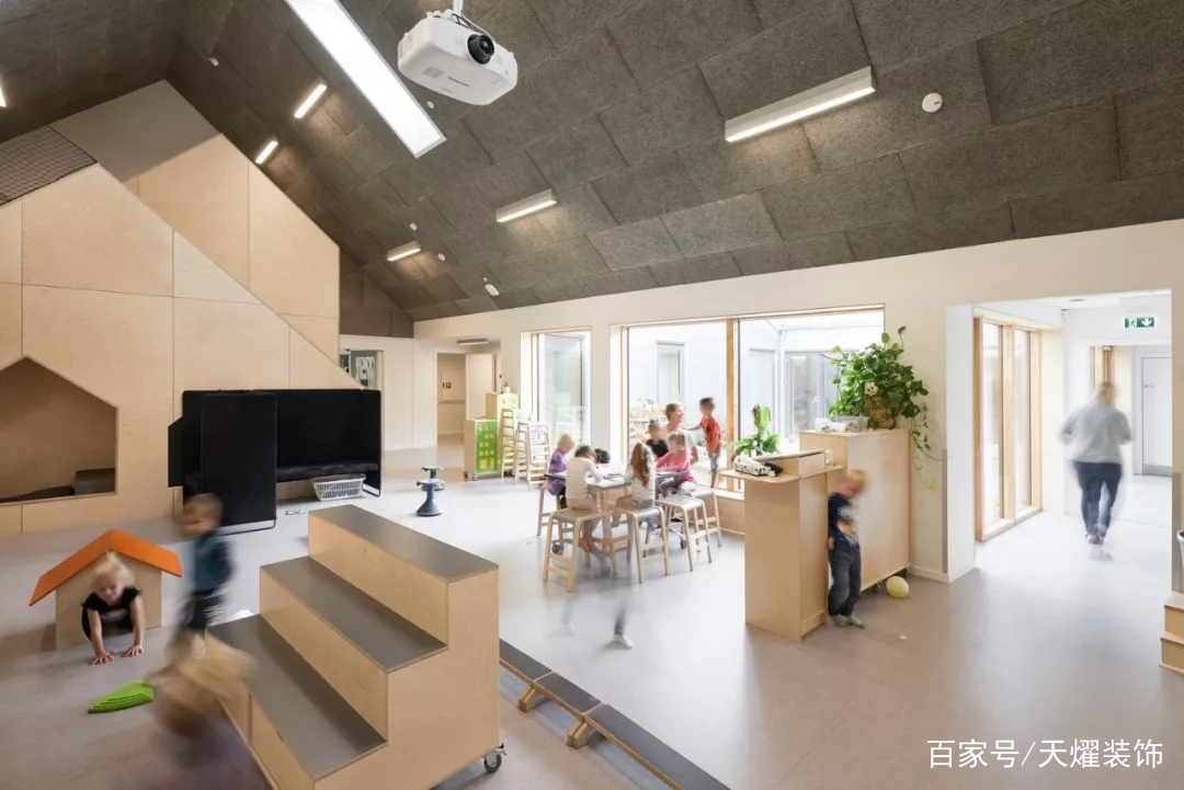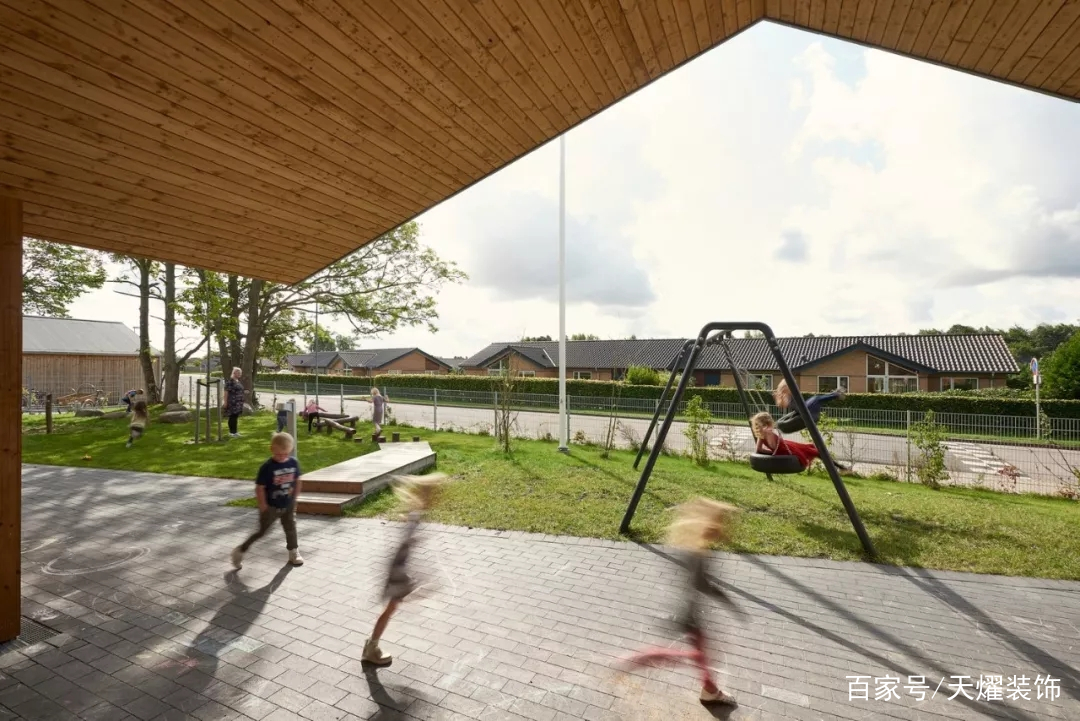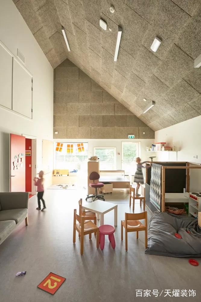 考慮到丹麥地理位置以及冬季和黑夜較長的因素,設計師們充分利用了大自然的光線。在園所設計中多采用原木材料的隔熱外殼,減少熱損失。由于大量木材的使用,這種與大自然的融合給孩子們帶來親切感。
