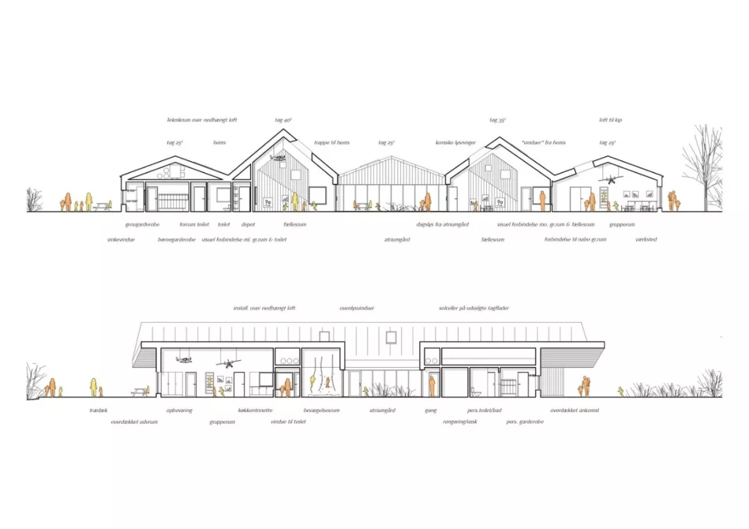 設計師根據丹麥當地的本土文化和地理位置,在園所建筑外觀上有著獨特的設計風格—屋頂幾何形狀的設計以及將整體建筑的尺度縮小到孩子們體格身高的尺寸,這讓孩子們更有安全感,同時也更有效的幫助他們理解空間的幾何概念。
